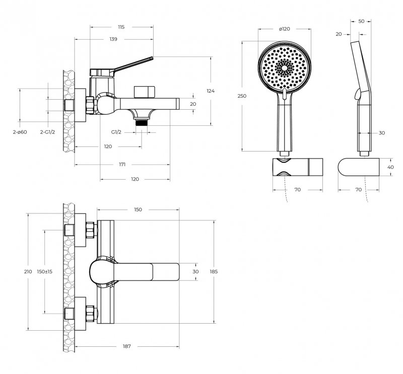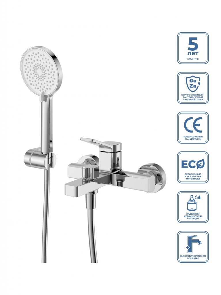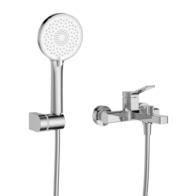 Оснащение: душевой шланг ПВХ, душевая лейка 3-х режимная из ABS, настенный держатель ручного душа, смеситель