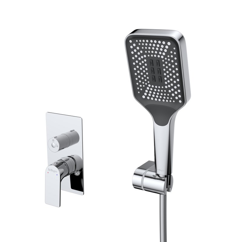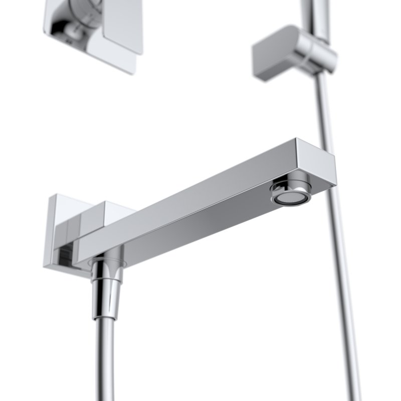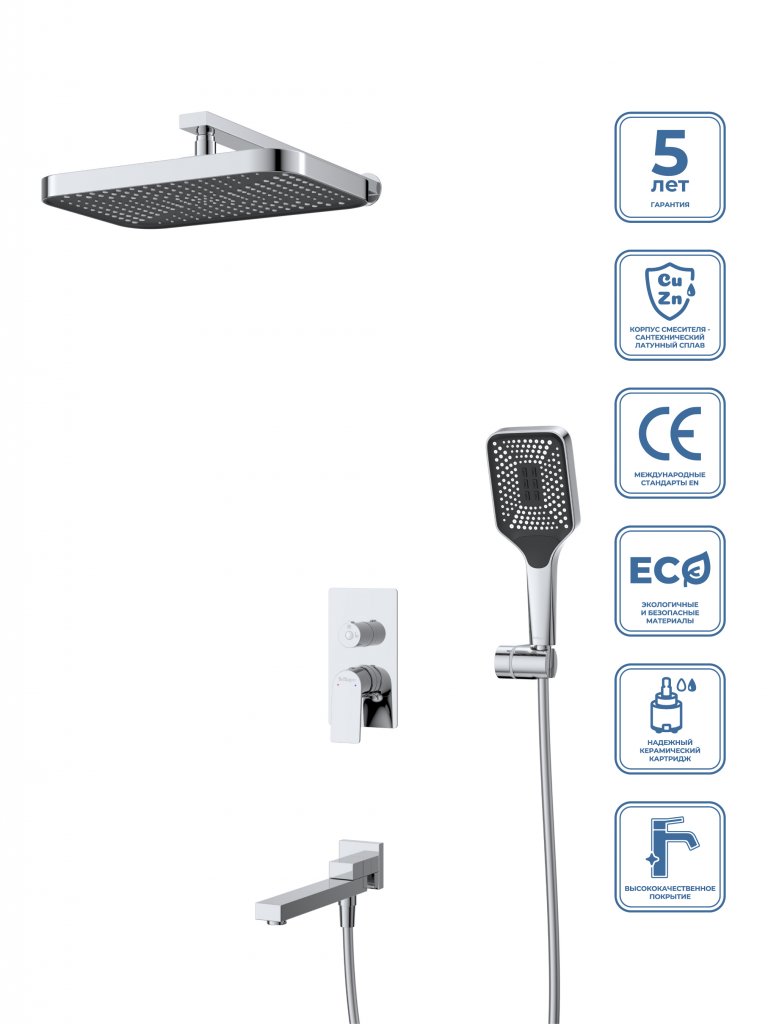 Оснащение: встраиваемый смеситель с переключателем на два выхода, верхний душ с кронштейном, излив для ванны, ручной душ 3-х режимный со шлангом, штуцером и держателем
