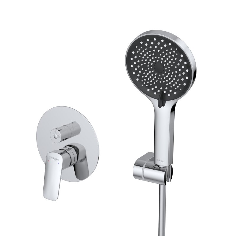 Оснащение: встраиваемый смеситель с переключателем на два выхода, верхний душ с кронштейном, излив для ванны, ручной душ 3-х режимный со шлангом, штуцером и держателем