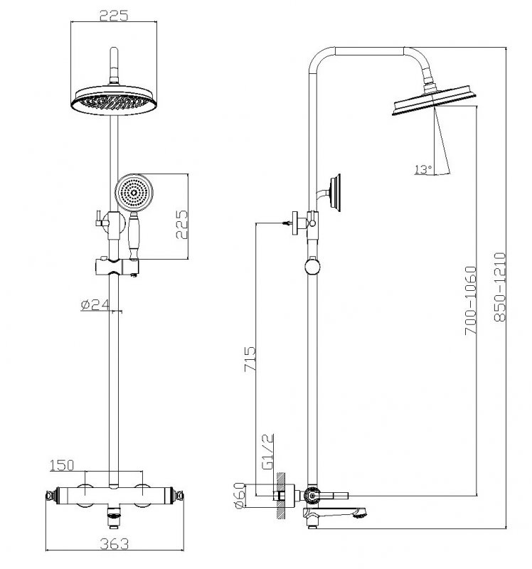 Оснащение: эксцентрики, душевой шланг ПВХ длиной 150 см, ручной душ из нержавеющей стали, верхний душ из нержавеющей стали, смеситель с поворотным изливом