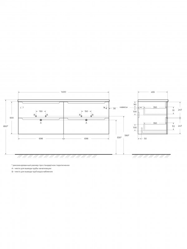 ETNA-1400-4C-SO-2-VOБаза под раковину подвесная с четырьмя выкатными ящиками для раковины с двумя чашами 1400x455x500Еловый Матовый
