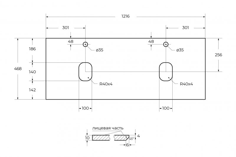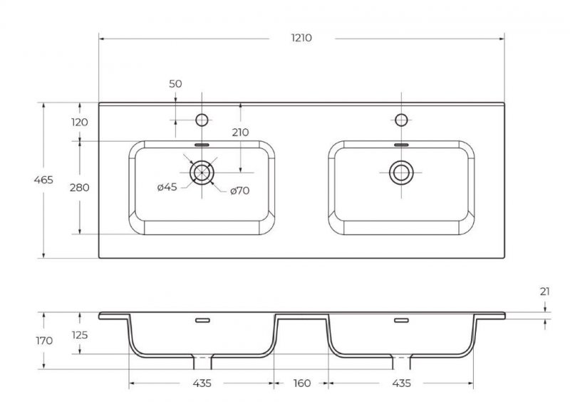 KEP-120-2-CEMСтолешница из керамогранита с двумя отверстиями под раковину и с двумя отверстиями под смеситель 1216x468Cemento