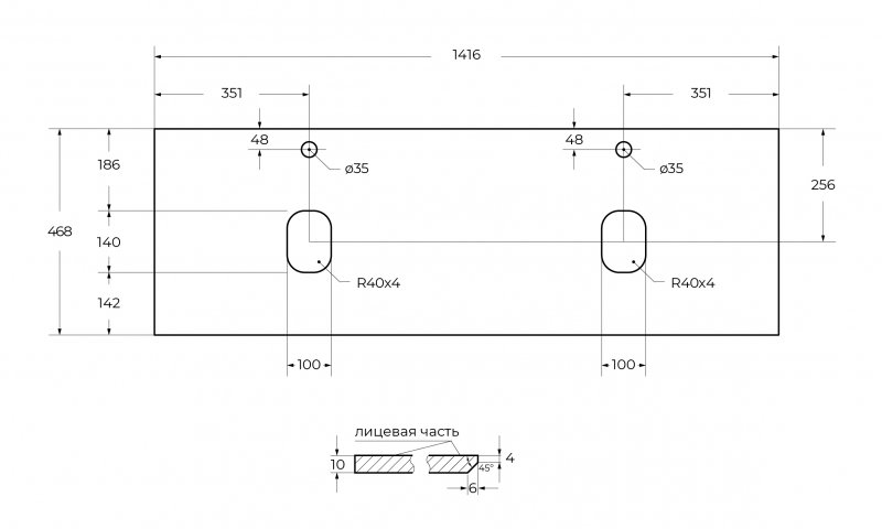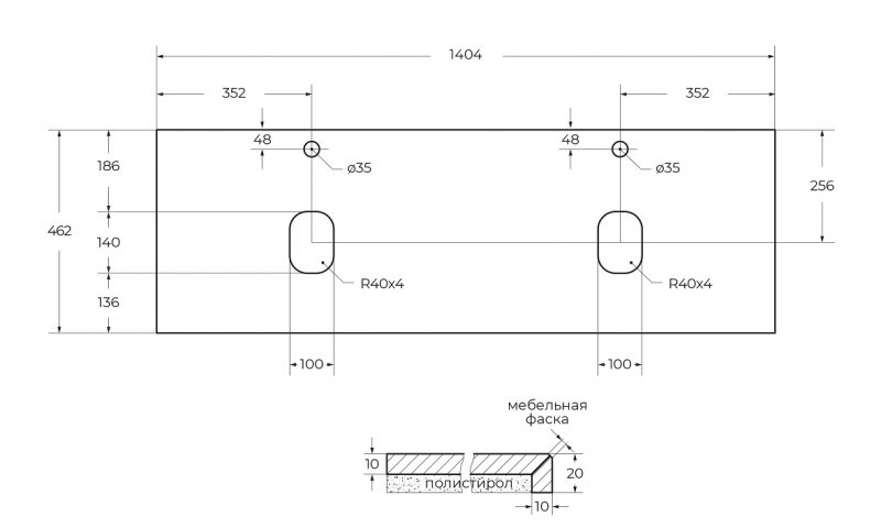 KEP-140-2-CEMСтолешница из керамогранита с двумя отверстиями под раковину и с двумя отверстиями под смеситель 1416x468Cemento