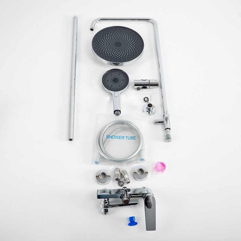 Оснащение: эксцентрики, переключатель потоков, душевой шланг ПВХ длиной 150 см, ручной душ 3-х режимный, верхний душ, смеситель с поворотным изливом
